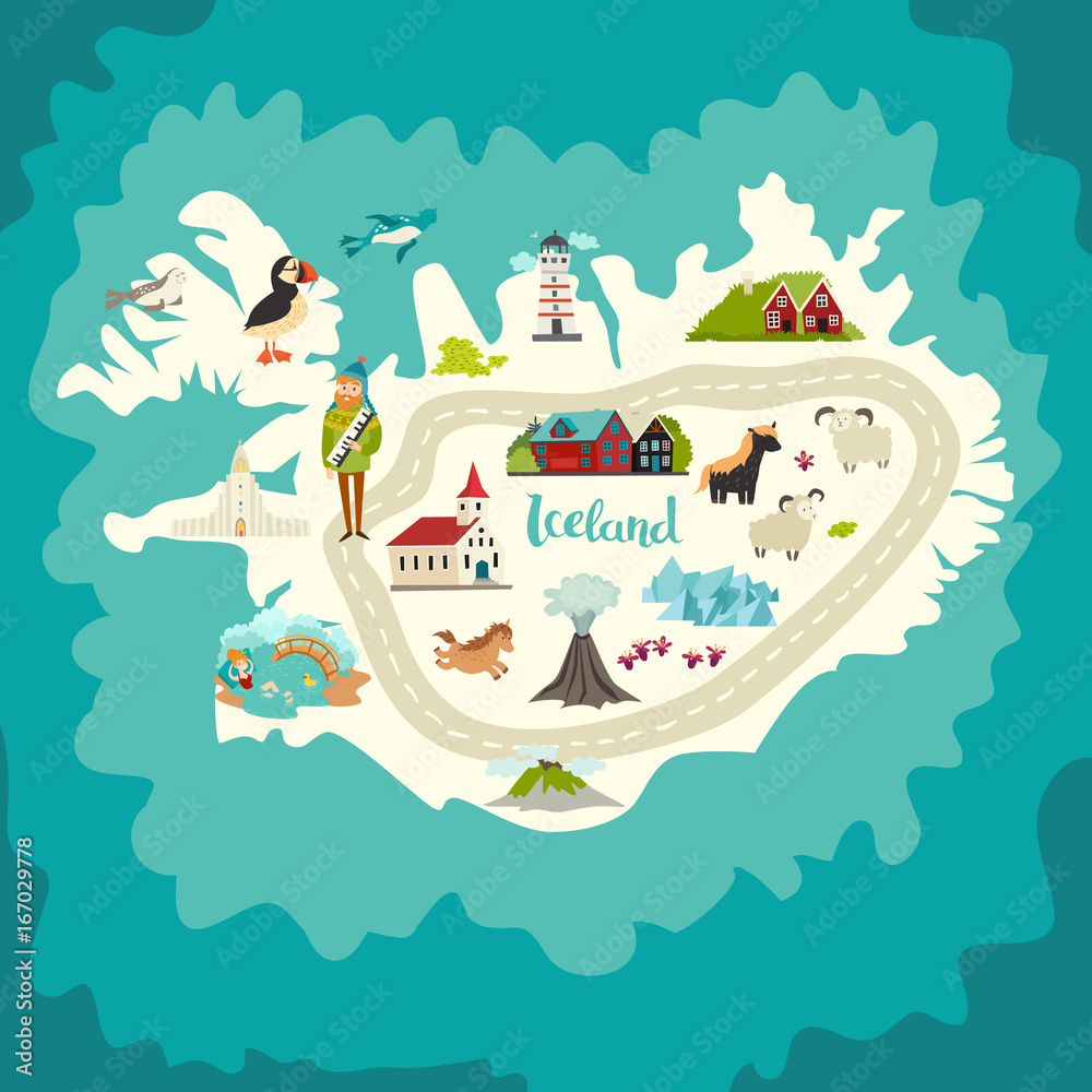 Iceland map landmarks. Handdrawn vector illustration. Landmark of