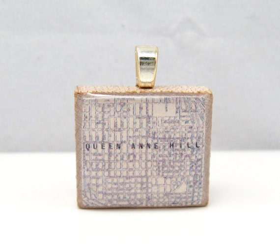 Queen Anne Hill in Seattle 1924 Vintage Scrabble Tile Map Pendant